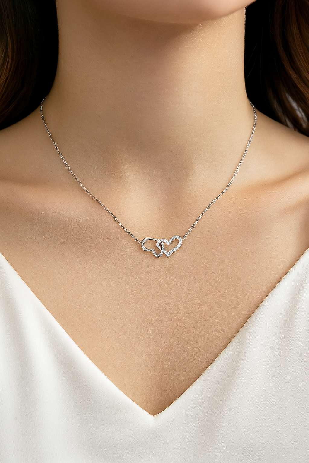 Colierul este confecționat din argint de înaltă calitate, iar stratul subțire de rodium conferă bijuteriei o strălucire durabilă și rezistență la uzură. Cele două pandantive în formă de inimă sunt plasate simetric, sugerând armonie și unitate.