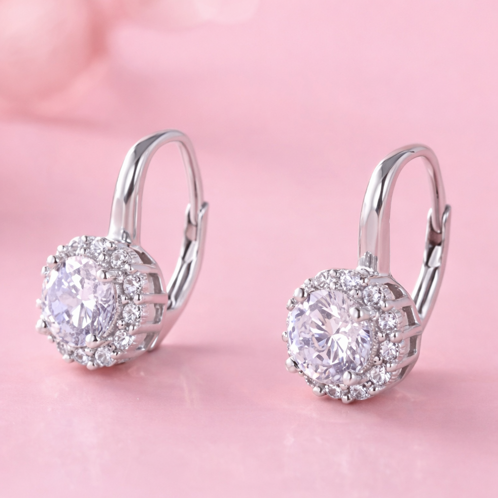 O pereche de cercei din argint 925 rodiat, cu design elegant spectaculor. Zirconul central este inconjurat de zirconii stralucitoare translucide, oferind note de stil purtatoarei. Este o bijuterie argint desavarsita, atemporala, ce poate fi purtata ani la randul, fara a se demoda.
